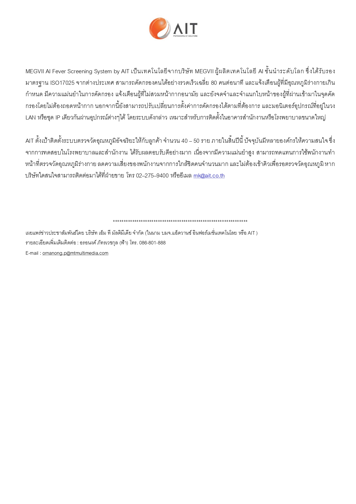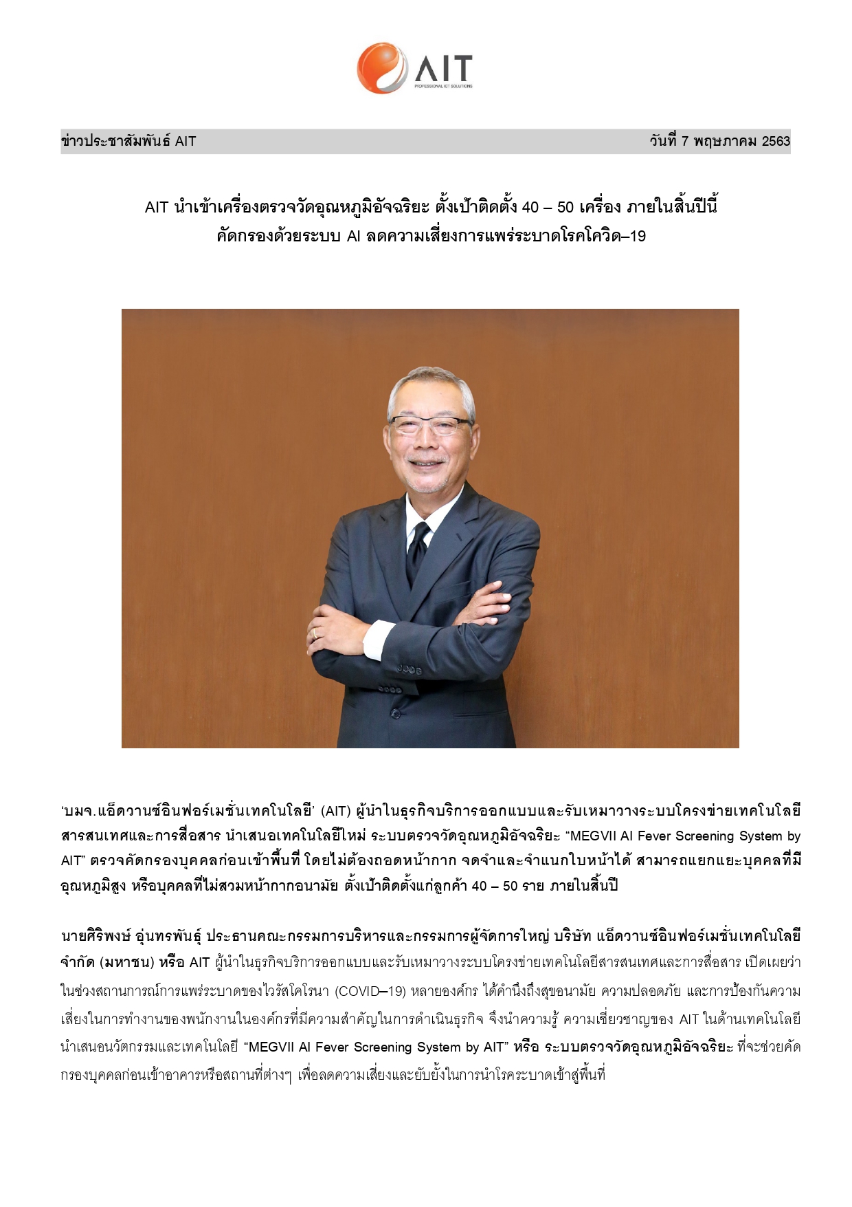 AIT นำเข้าเครื่องตรวจวัดอุณหภูมิอัจฉริยะ ตั้งเป้าติดตั้ง 40 – 50 เครื่อง ภายในสิ้นปีนี้ คัดกรองด้วยระบบ AI ลดความเสี่ยงการแพร่ระบาดโรคโควิด-19